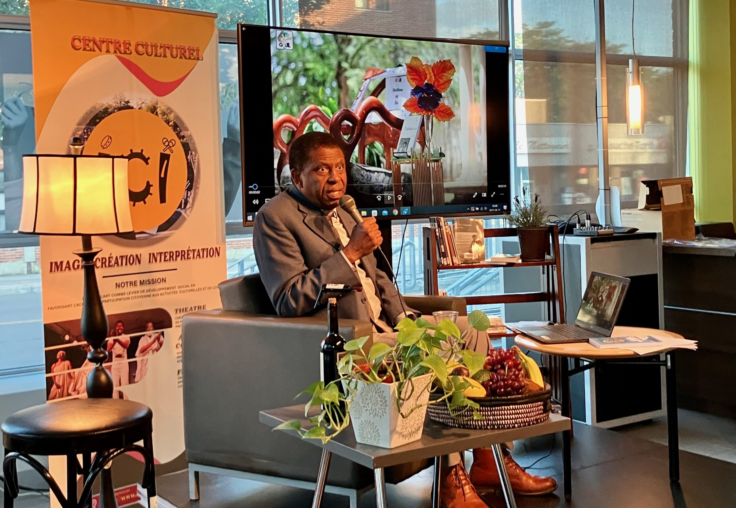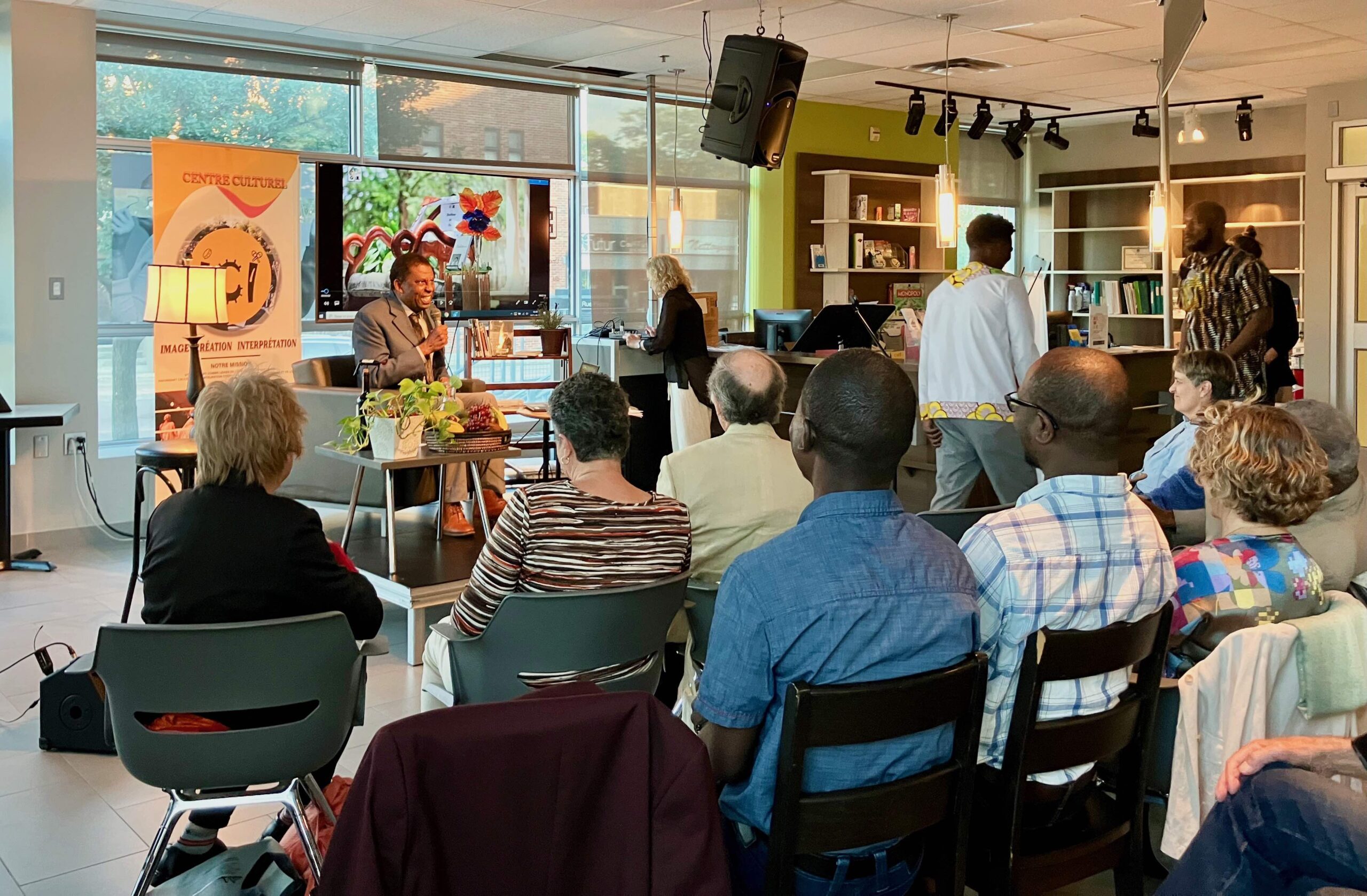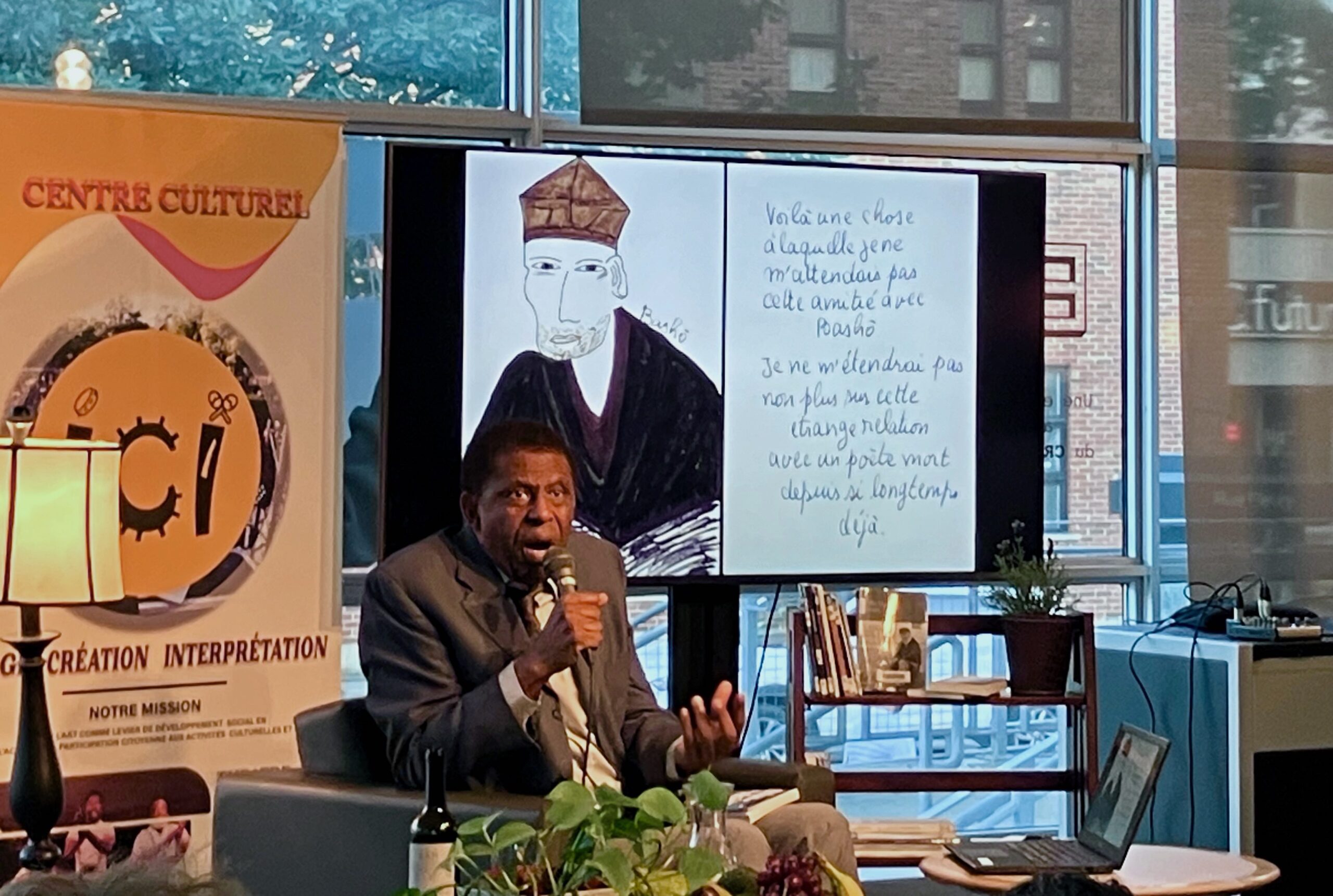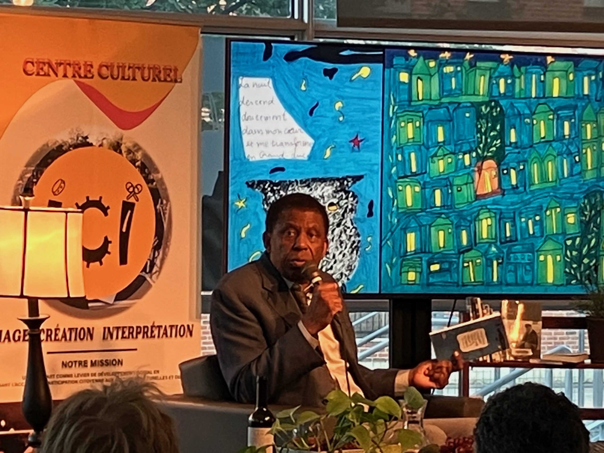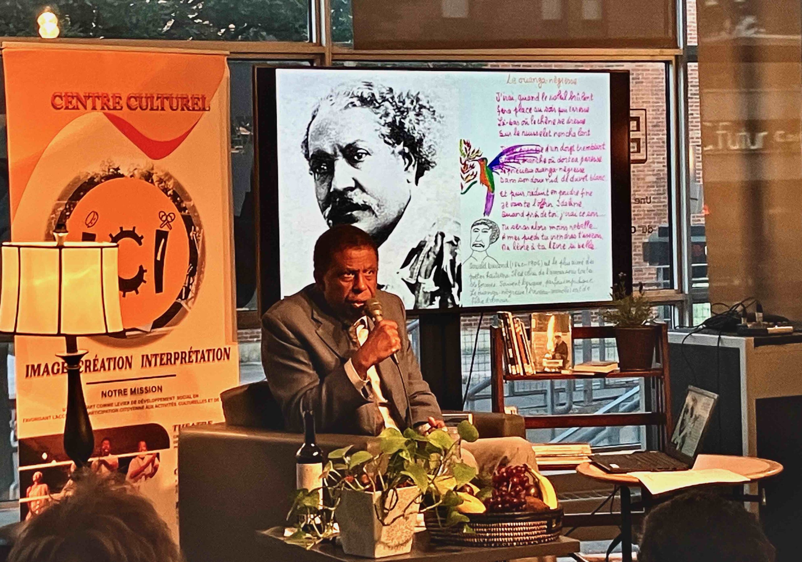 M. Laferrière a présenté son livre Dans la splendeur de la nuit, qu’il a lui-même illustré. Il nous a lu des poèmes d’écrivains haïtiens et d’ailleurs, parfois accompagnés de musique, dans une ambiance chaleureuse!