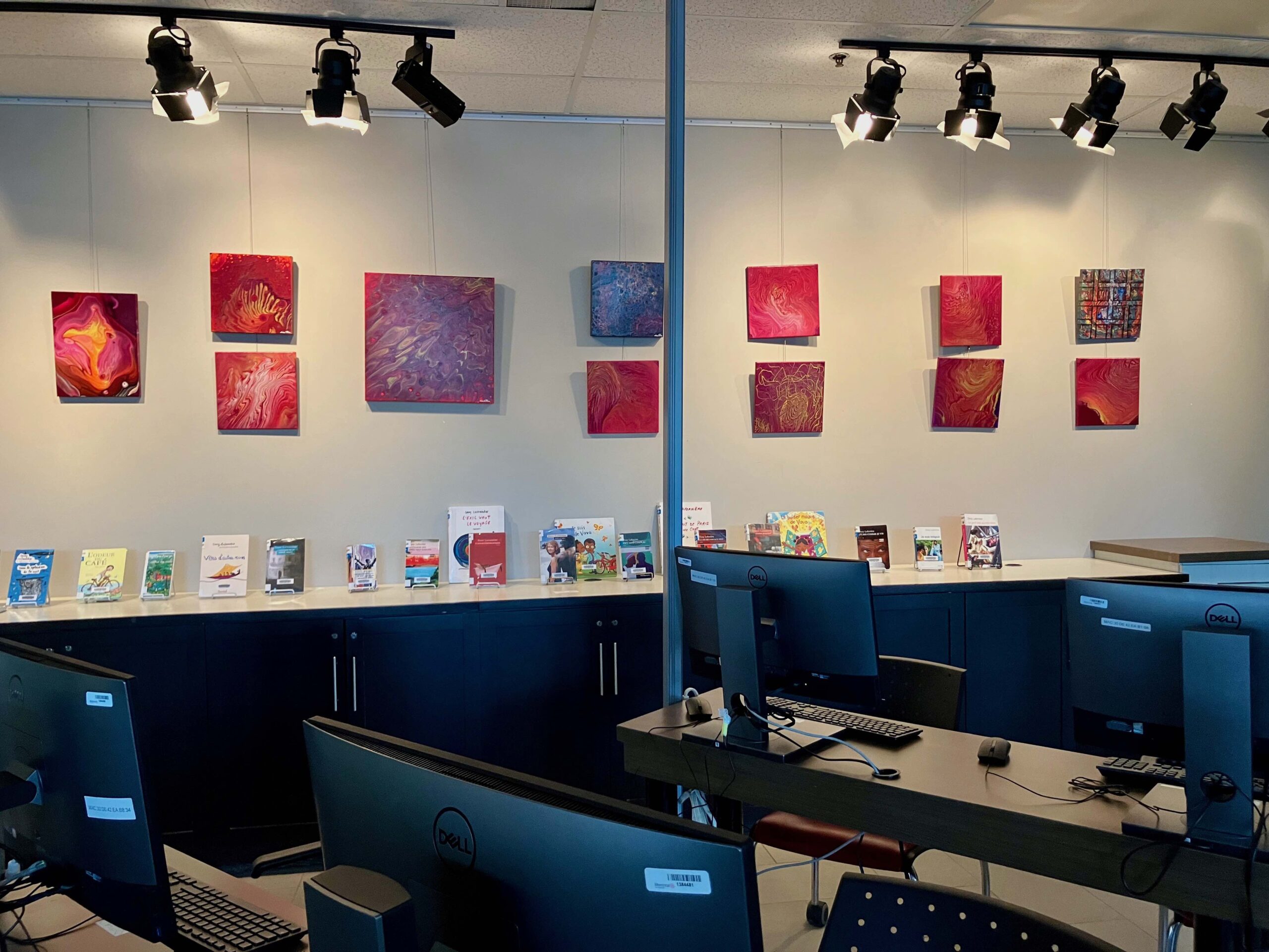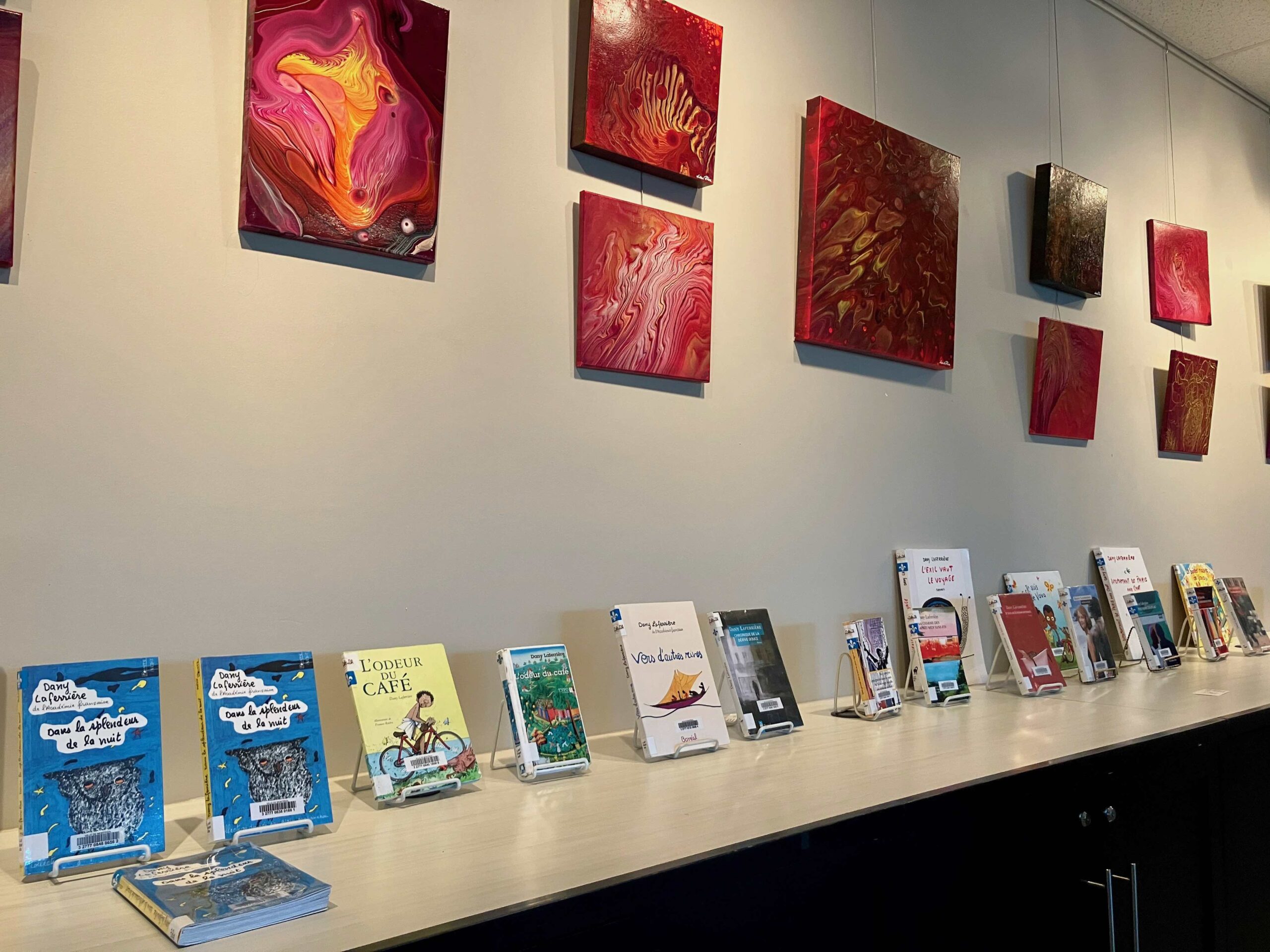 Café de Da à la bibliothèque d’Ahuntsic. Belle encontre littéraire «Un auteur, un livre» avec Dany Laferrière, le jeudi 31 août 2023, organisée par le Centre culturel ICI. Tous ses livres sont disposés le long du mur et appellent les lecteurs à venir les réserver à la bibliothèque. (Photo: Anne Marie Parent, JDV)