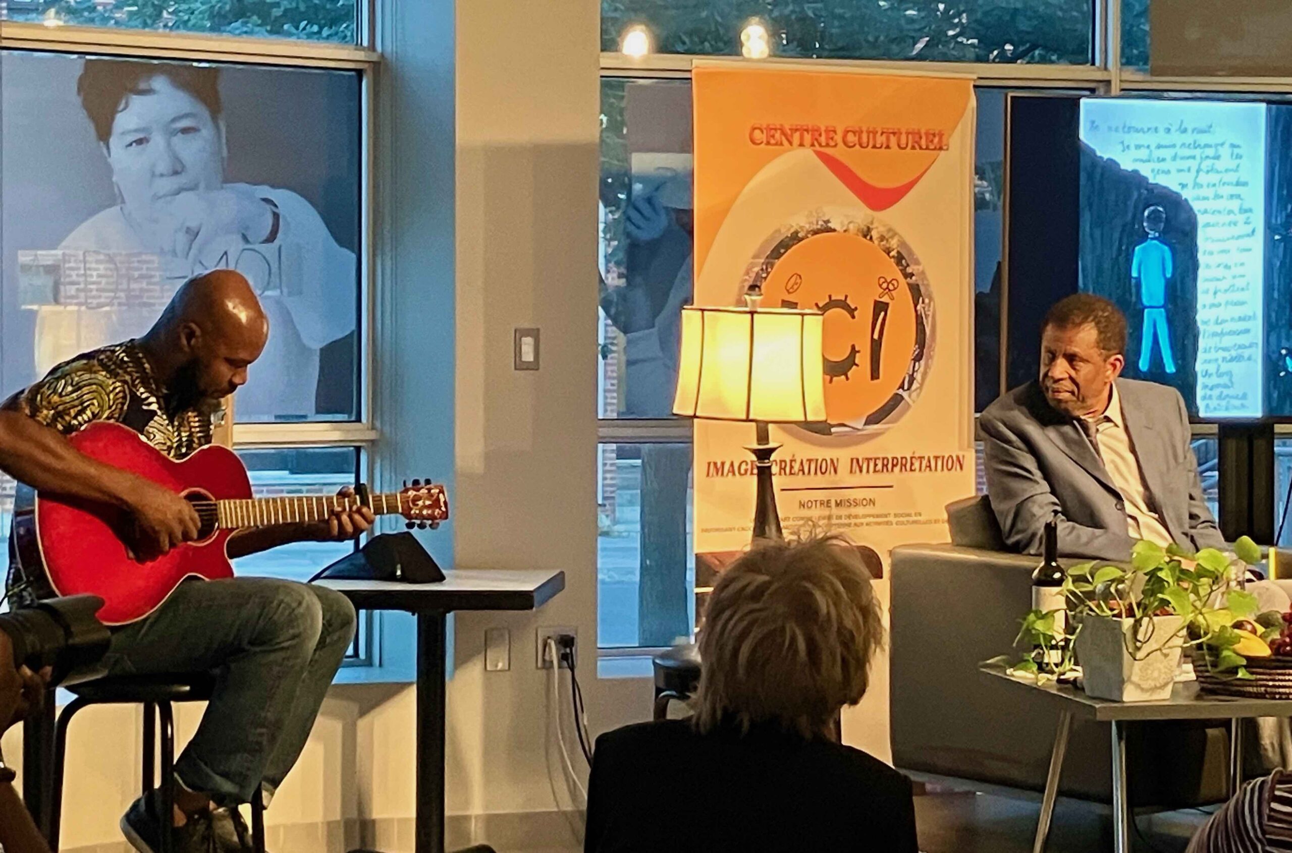 Le guitariste Luckson Casimir et l’écrivain Dany Laferrière à la belle rencontre littéraire «Un auteur un livre» au Café de Da, le 31 août 2023, organisée par le Centre culturel ICI. (Photo: Anne Marie Parent, JDV)