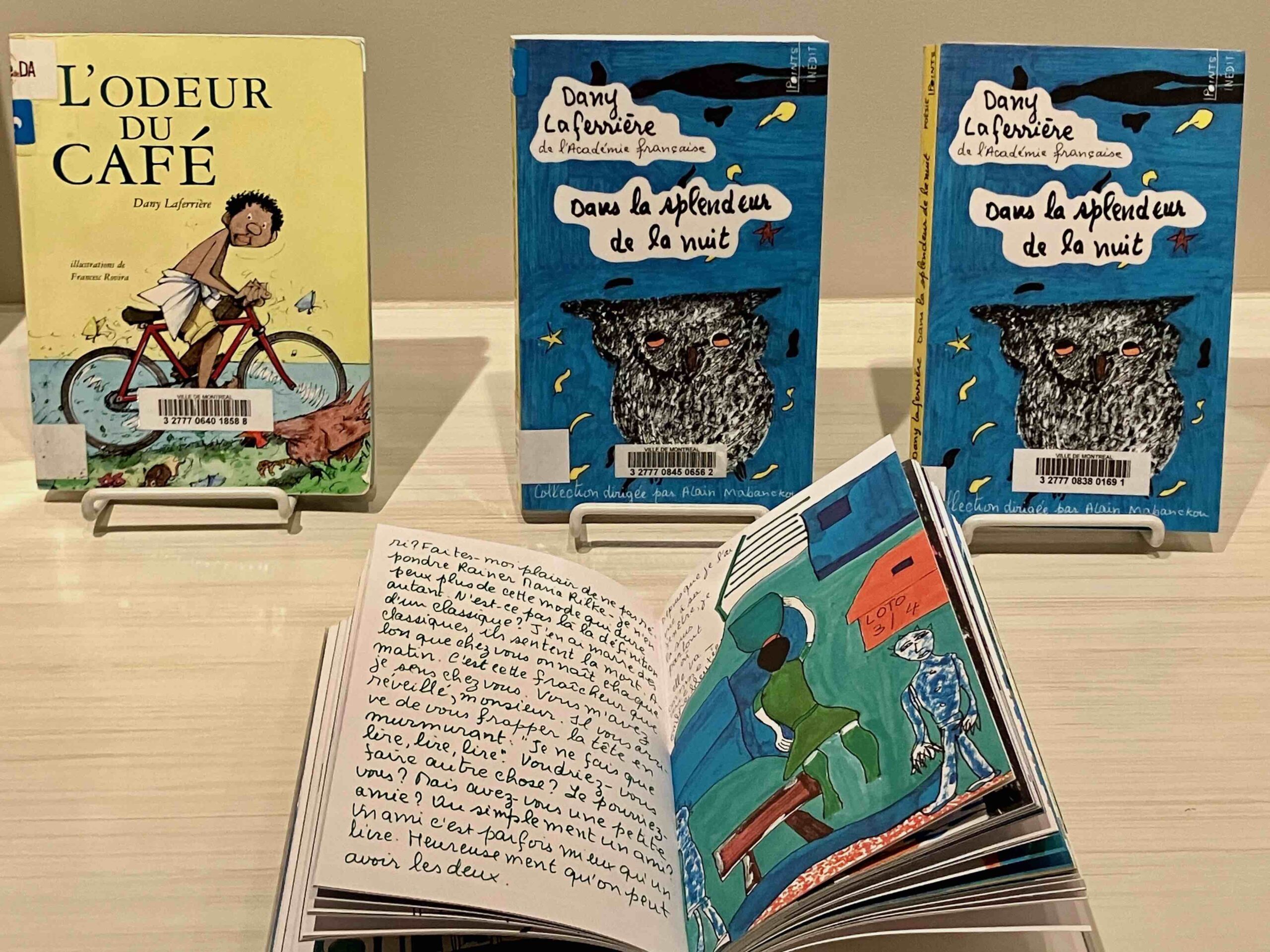 Livres de Dany Laferrière, dont celui duquel il nous entretenait (Dans la splendeur de la nuit) à la belle rencontre littéraire «Un auteur un livre» au Café de Da, le 31 août 2023. Cette soirée était organisée par le Centre culturel ICI. (Photo: Anne Marie Parent, JDV)