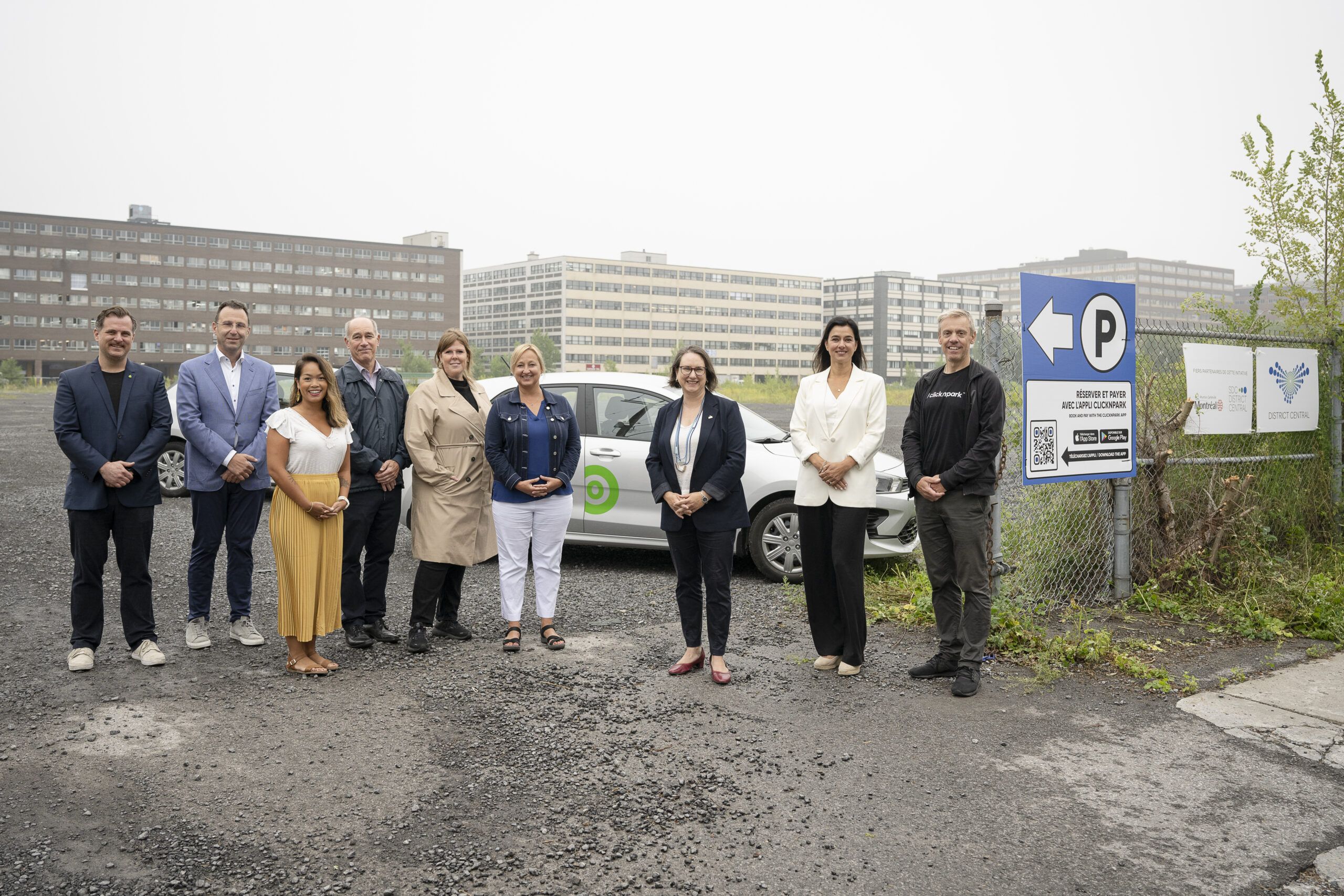 Se sont réunies les personnes impliquées dans ce programme: Mme Émilie Thuillier, mairesse de l’arrondissement d’Ahuntsic-Cartierville, Mme Hélène Veilleux, directrice générale et Geneviève Dufour, directrice stratégie et relations d’affaires de la SDC District Central, M. Carl Grenier, président, Mme Sara Joli-Coeur, vice-présidente exécutive de clicknpark.com, Stationner sans détour, Mme Nathalie Pen, gestionnaire Marketing et Développement, M. Gabriel Sims, planificateur de réseaux de Communauto, M. Lorne Lieberman, propriétaire du 55, rue Louvain Ouest, ainsi que M. Jean-François Soulières, commissaire au développement économique d’Ahuntsic-Cartierville, qui se sont rendus sur le terrain du 50-150 Louvain Ouest, où sera situé un des stationnements de la mutualisation des espaces clicknpark, stationner sans détour.