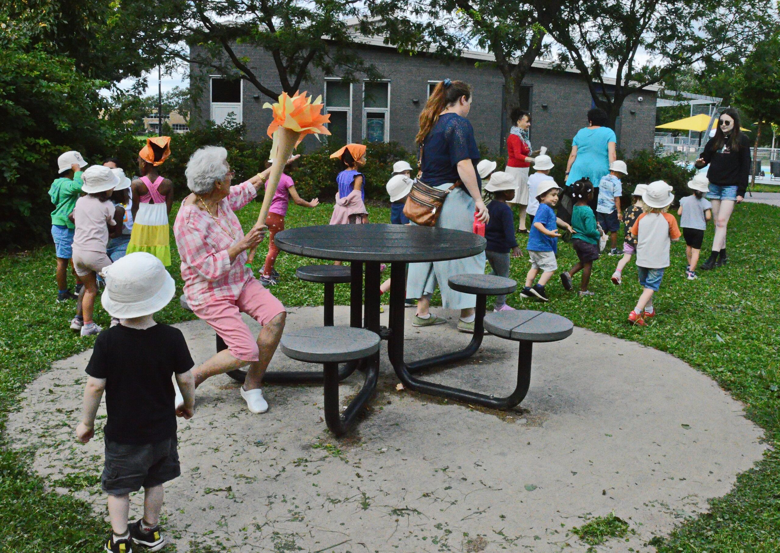France Laget Chambefort avec la flamme olympique, aux Olympiades des garderies L’Abri et La Bonbonnière. Les enfants s’apprêtent à retourner dans leur garderie respective après l’activité et le lunch. (Photo: Anne Marie Parent, JDV)
