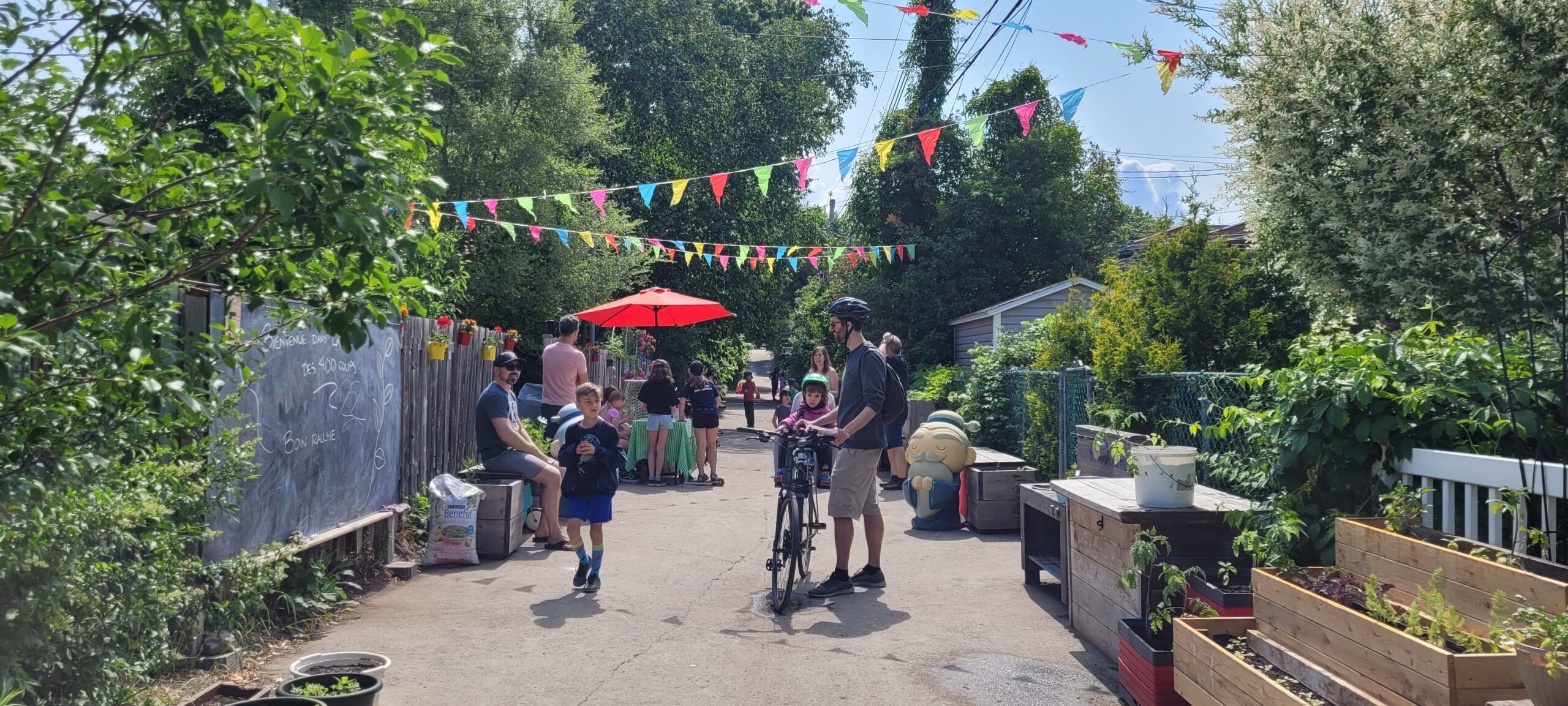 Le trajet, entièrement prévu sur les pistes d’Ahuntsic-Cartierville, amenait ensuite les cyclistes (majoritairement des familles avec des enfants de tous âges), vers l’étape 2, où les attendaient les résidents de la Ruelle des 400 Coups! Les participants devaient résoudre des charades, en se promenant dans la ruelle.