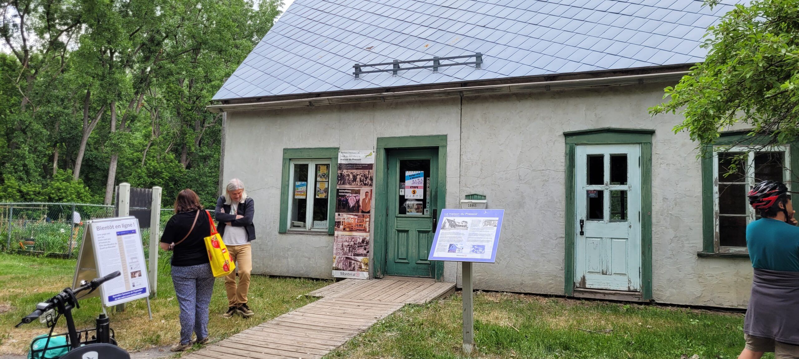 L’étape 5 faisait traverser le parc de l’île de la Visitation, pour s’arrêter à la Maison du Pressoir, où Jacques Lebleu, coordonnateur de la Société d’histoire d’Ahuntsic-Cartiervielle (SHAC), attendait les cyclistes avec une question à laquelle il fallait répondre. Les participants ont été nombreux à rentrer dans la maison (lors de la mini averse) pour découvrir les lieux, rencontrer l’animateur de la Maison du Pressoir et observer l’exposition temporaire «Broder ses racines».
