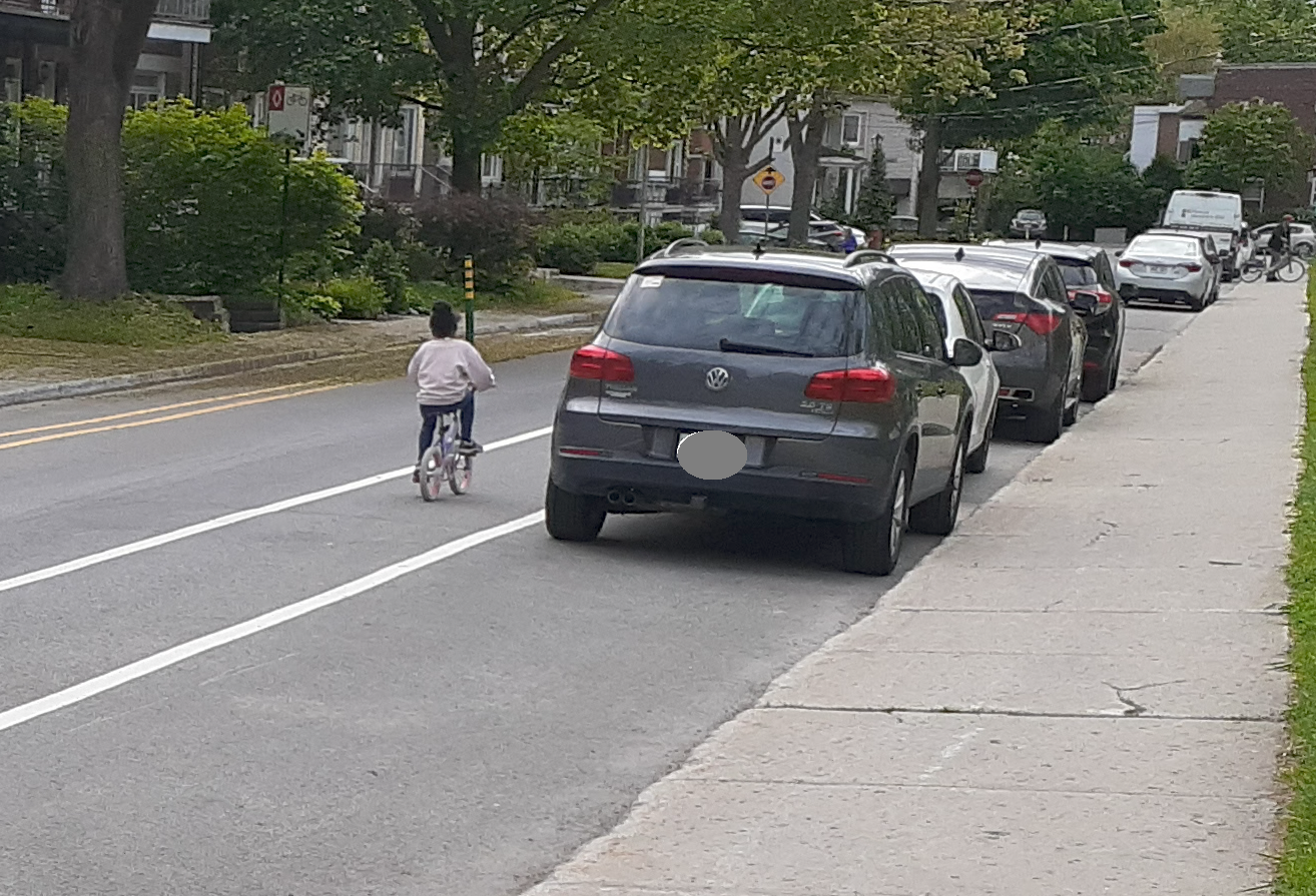 Les bandes cyclables (bandes peintes au sol le long des voitures, sans bollards ou autre protection) seraient encore moins sécuritaires à cause des risques d’emportiérage (porte d’auto qui s’ouvre) ou des risques de dépassements dangereux par les véhicules motorisés. Elles ne sont donc pas recommandées sur les rues à haut taux de roulement de véhicules garés.