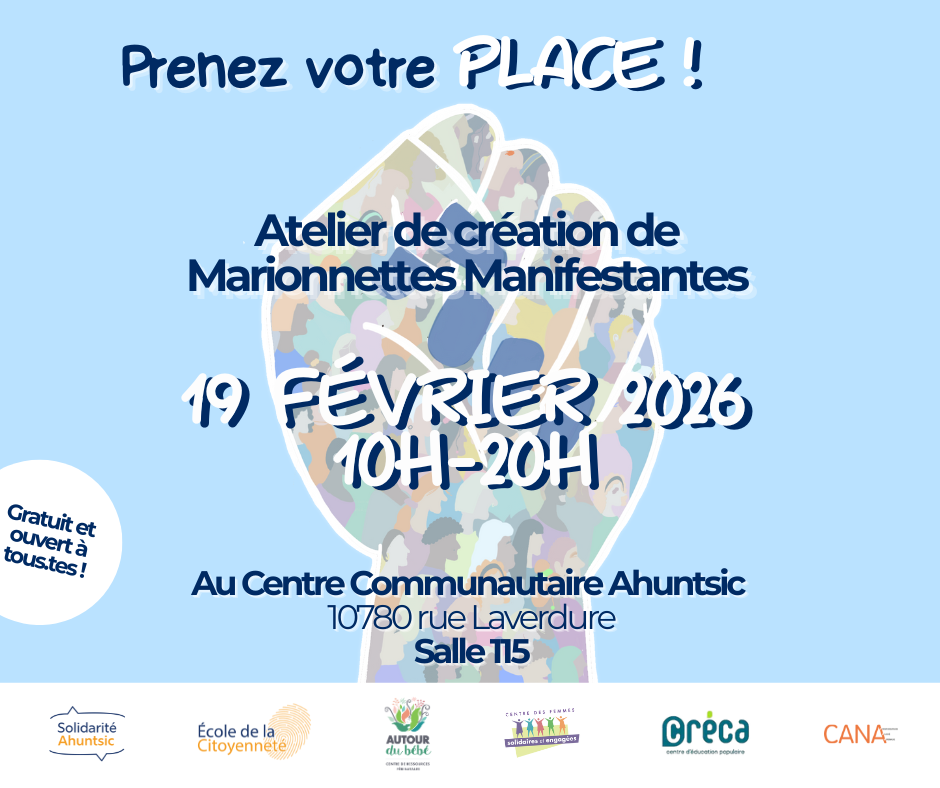 Pour la Journée internationale des droits des femmes, Solidarité Ahuntsic, le CRÉCA, Centre des Femmes Solidaires et Engagées, Autour du Bébé et le CANA organisent un atelier de création de marionnettes manifestantes le 19 février, de 10h à 20h au centre communautaire Ahuntsic.
