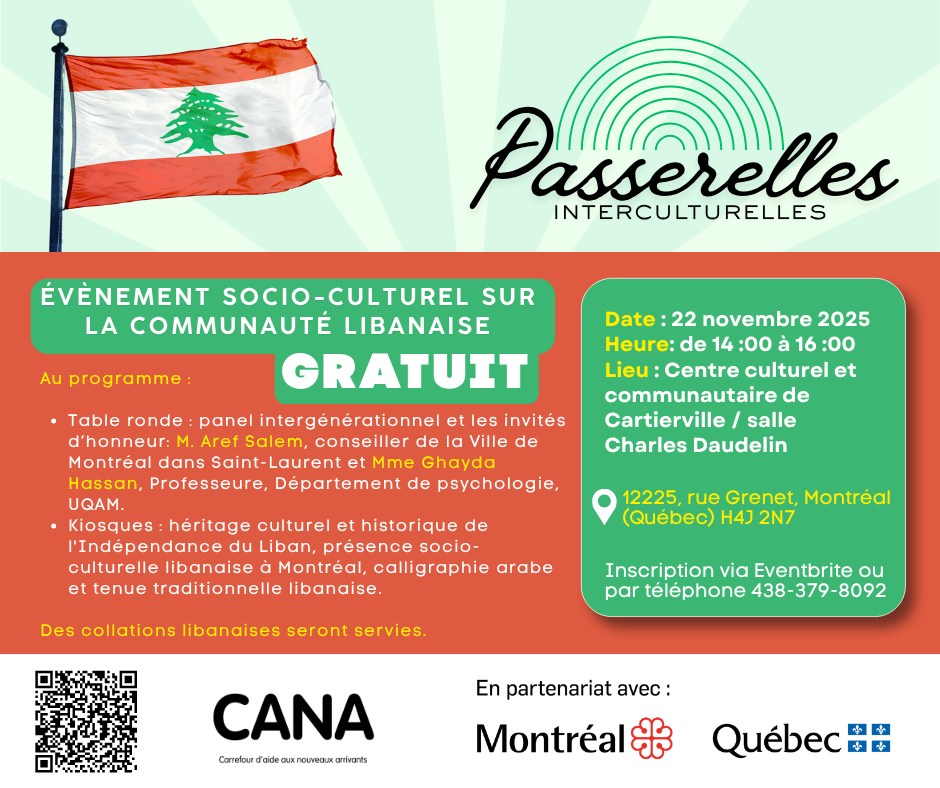 Dans le cadre du projet Passerelles interculturelles, le Carrefour d’aide aux nouveaux arrivants (CANA) organise un évènement socioculturel sur la communauté libanaise. Celui-ci aura lieu le 22 novembre de 14 h à 16 h au Centre culturel et communautaire de Cartierville.