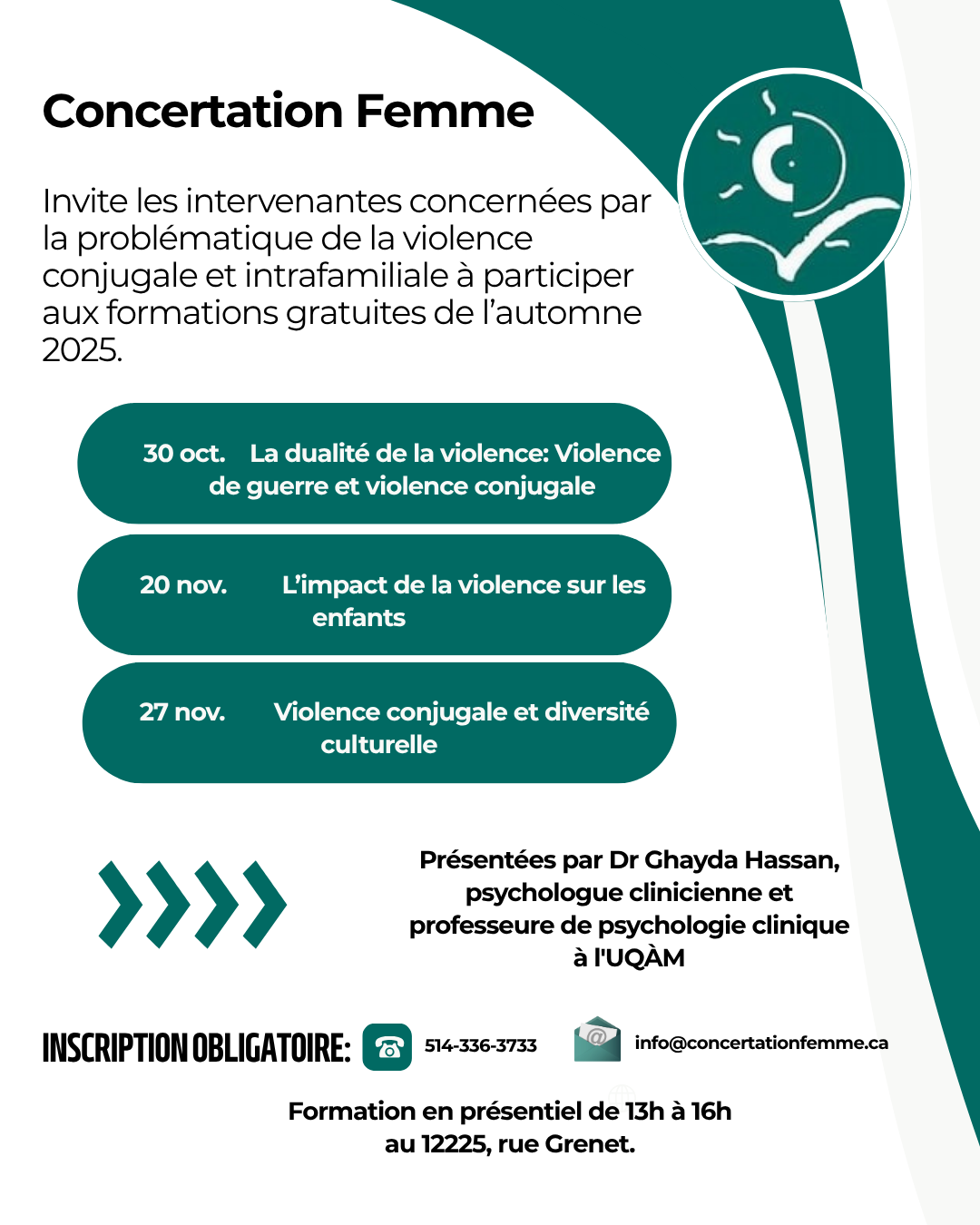 Concertation Femme présente deux activités gratuites sur la violence intrafamiliale et conjugale. Ces ateliers sont offerts aux intervenantes. Ils seront animés par Dr Ghayda Hassan, psychologue clinicienne et professeure à l’UQAM.