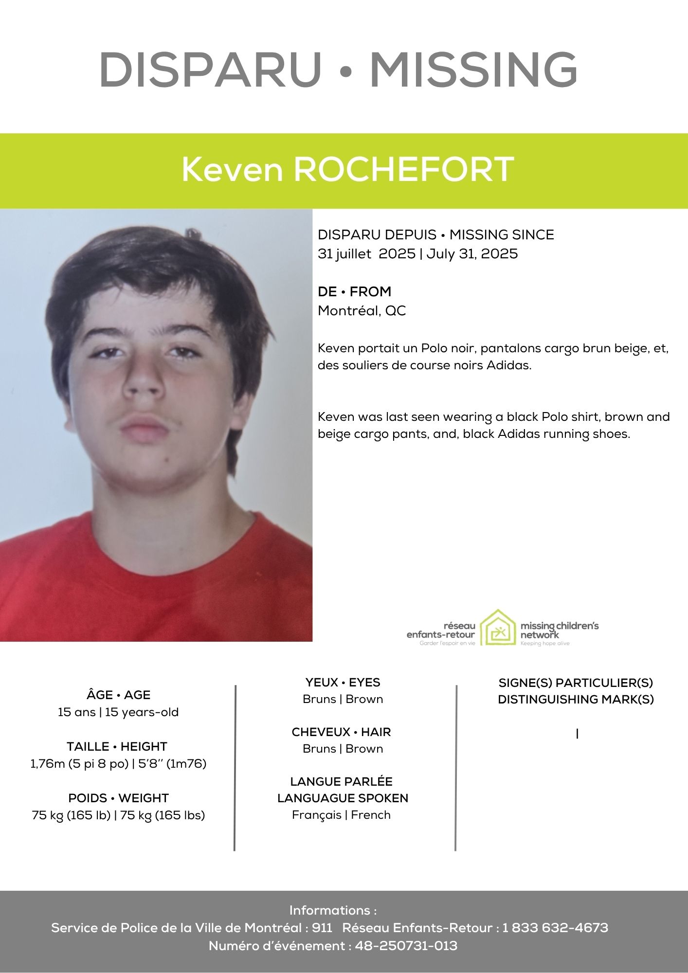 Une nouvelle famille de l’arrondissement Ahuntsic-Cartierville vit des heures d’inquiétude. Pour cause, l’un des leurs, Keven Rochefort, 15 ans, a disparu depuis le 31 juillet dernier.