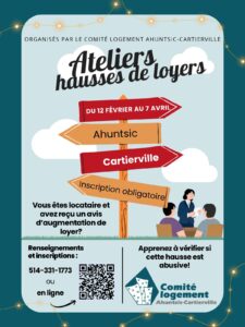 Le Comité logement Ahuntsic-Cartierville (CLAC) va mettre en place des ateliers, destinés aux locataires, dont l’objectif est d’évaluer si les augmentations de loyers sont abusives et d’informer les locataires de leurs droits face aux propriétaires.
