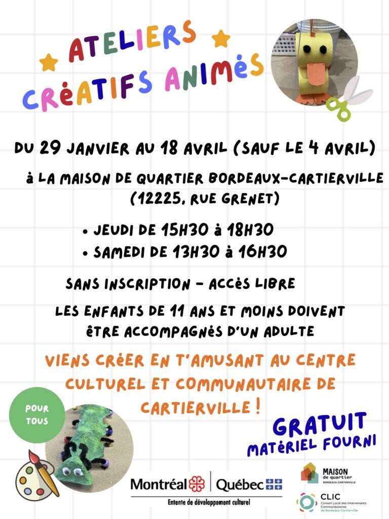 De nouveaux ateliers créatifs se tiendront au Centre culturel et communautaire de Cartierville tous les jeudis et samedis. Les ateliers sont gratuits et ouverts à tous. Les enfants de 11 ans et moins doivent être accompagnés d’un adulte.