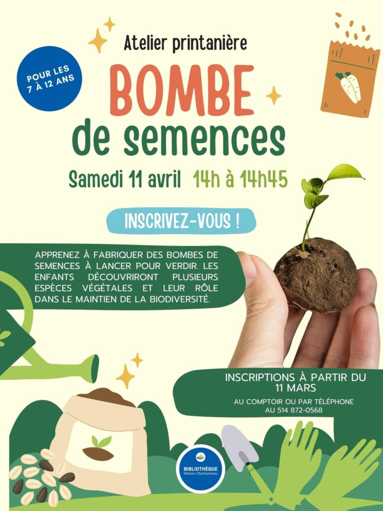 Les enfants sont invités à venir fabriquer des bombes de semences à lancer pour verdir, le samedi 11 avril, de 14 h à 14 h 45, à la bibliothèque Hélène-Charbonneau.