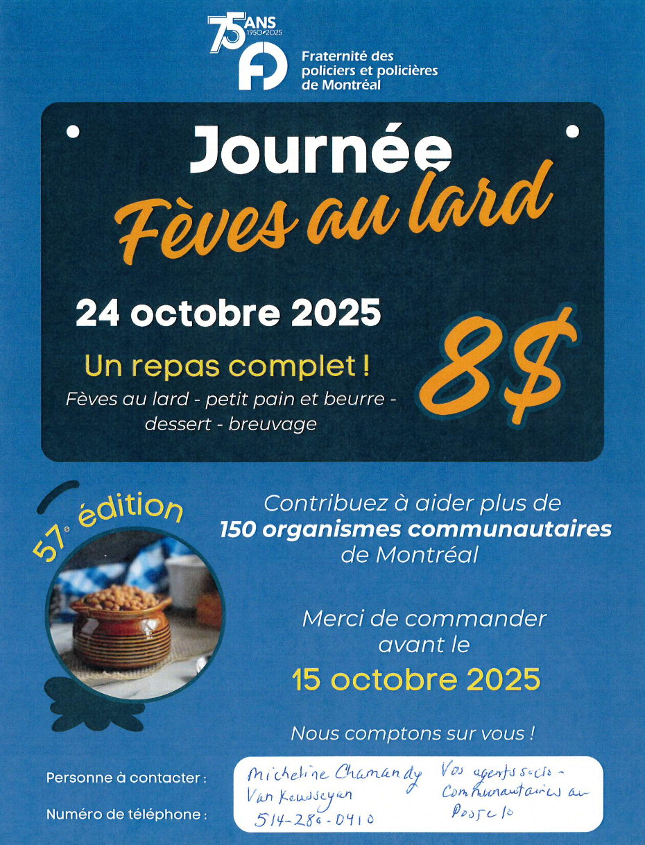 Le Fond humanitaire de la Fraternité des policiers et policières de Montréal organise la 57ièmeédition de la Journée fèves au lard. La moitié des profits récoltés par le Poste de quartier 10 seront repartagés dans un ou plusieurs organismes de la communauté de Bordeaux-Cartierville.