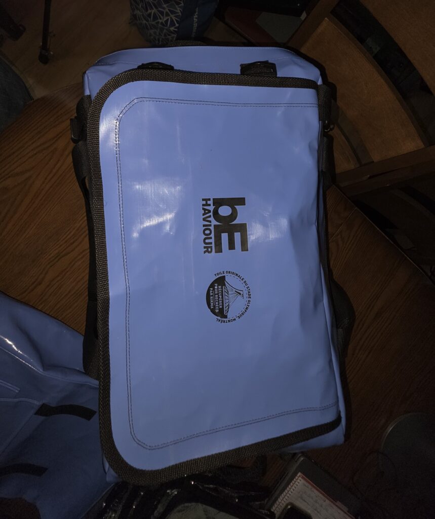 Un sac de sport d’Iso-Protek fait à partir de la toile du Stade olympique. Photo : Amine Esseghir / JDV