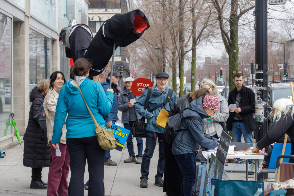 Ils se sont donné rendez-vous à midi devant le bureau de la députée fédérale de la circonscription, Mélanie Joly, pour faire entendre leur voix. Le groupe environnemental Mobilisation-environnement Ahuntsic-Cartierville (MEAC) et le Collectif de convergence citoyenne Ahuntsic-Cartierville (CCC-AC) ont organisé cette manifestation pour réclamer une « transition énergétique écologique et juste ».