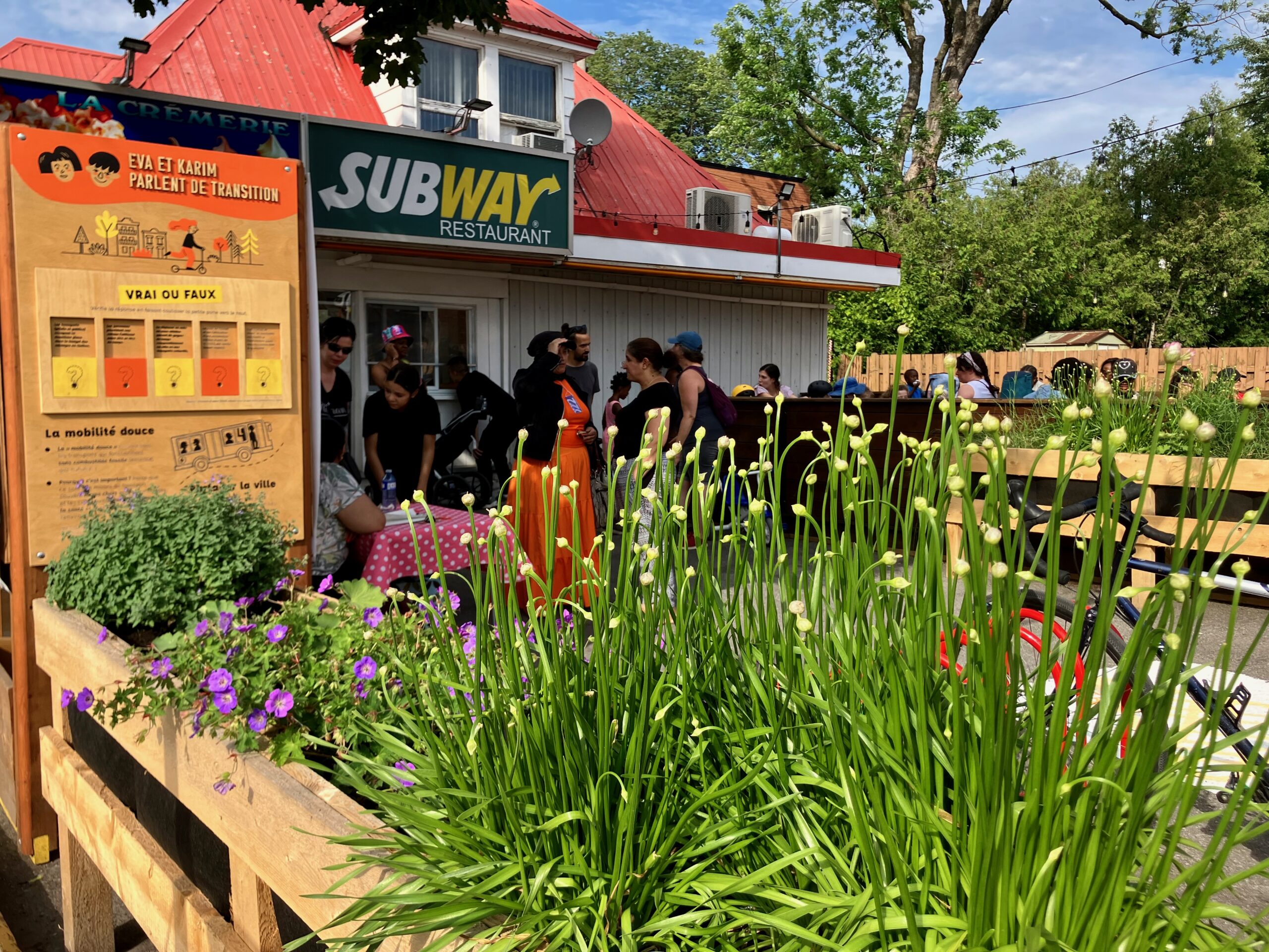 Ville en vert a fourni des bacs à plantes et Solon des supports à vélos, pour encourager le transport actif vers la crèmerie. Des panneaux d’information faits en bois présentent une exposition de photos sur des résident-e-s de l’arrondissement (Humain-e-s d’Ahuntsic, par Solon et Jacques Lebleu).