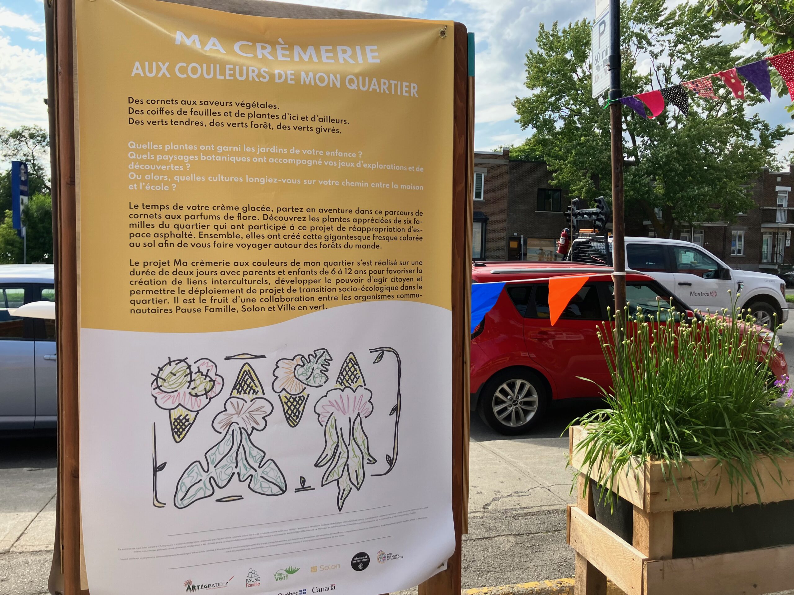 Cette fois-ci, Pause Famille a sollicité le collectif Solon et l’organisme Ville en vert pour créer le projet Ma crèmerie aux couleurs de mon quartier. Plus qu’une œuvre d’art collective, cette initiative avait également pour but de générer une action citoyenne, en ayant un impact sur la transition socio-écologique dans le quartier.