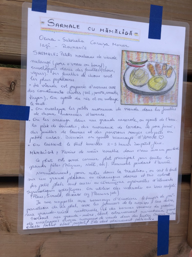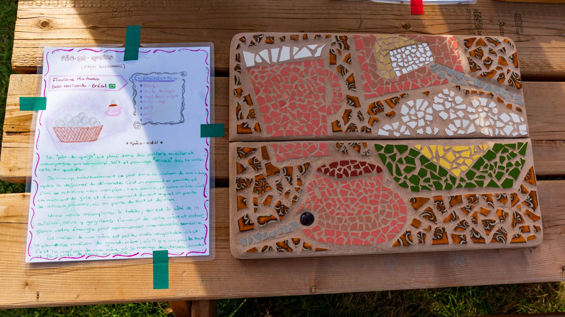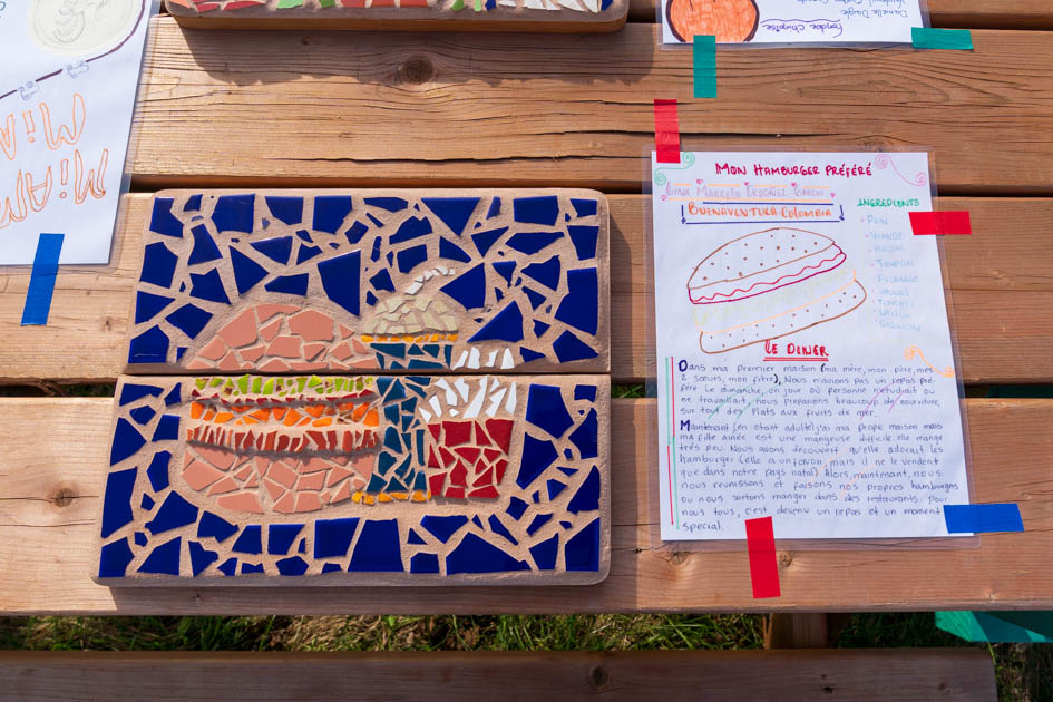 Il s’agit d’un projet où une douzaine de personnes, par le biais de plaques de céramiques assemblées en mosaïque, ont présenté leurs plats favoris consommés dans leur pays d’origine et les souvenirs qui leur sont associés. On a pu y voir 12 plateaux gourmands aux saveurs colorées de la Colombie, de l’Algérie, du Brésil, de la Roumanie, des États-Unis et du Québec.