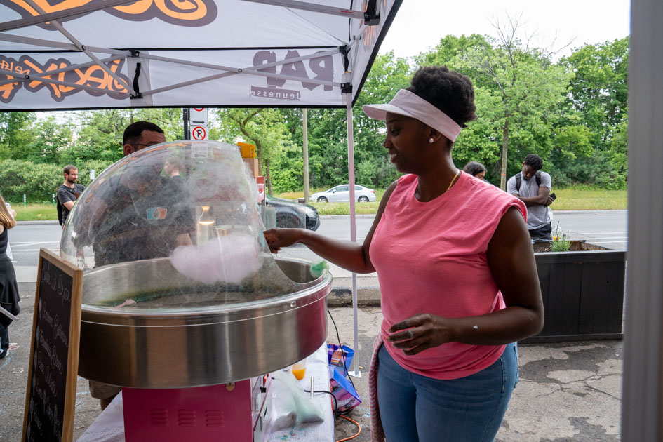 Pendant ce temps, à l’extérieur, Jennifer sert du maïs soufflé et de la barbe à papa lors de l’inauguration du Spot. (Photo: François Robert-Durand, JDV)