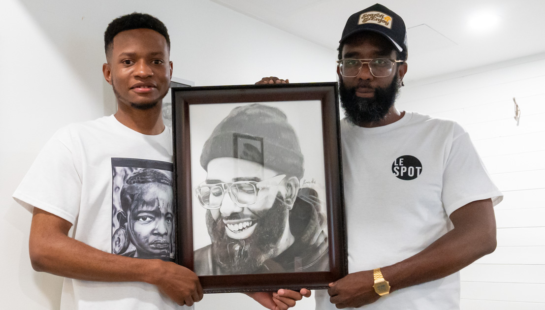 James, un résident des HLM Saint-Sulpice et Greg Pradel, chargé de projet pour le CJE ABC, tiennent un dessin fait par James à l’effigie… de Greg (Photo: François Robert-Durand, JDV)