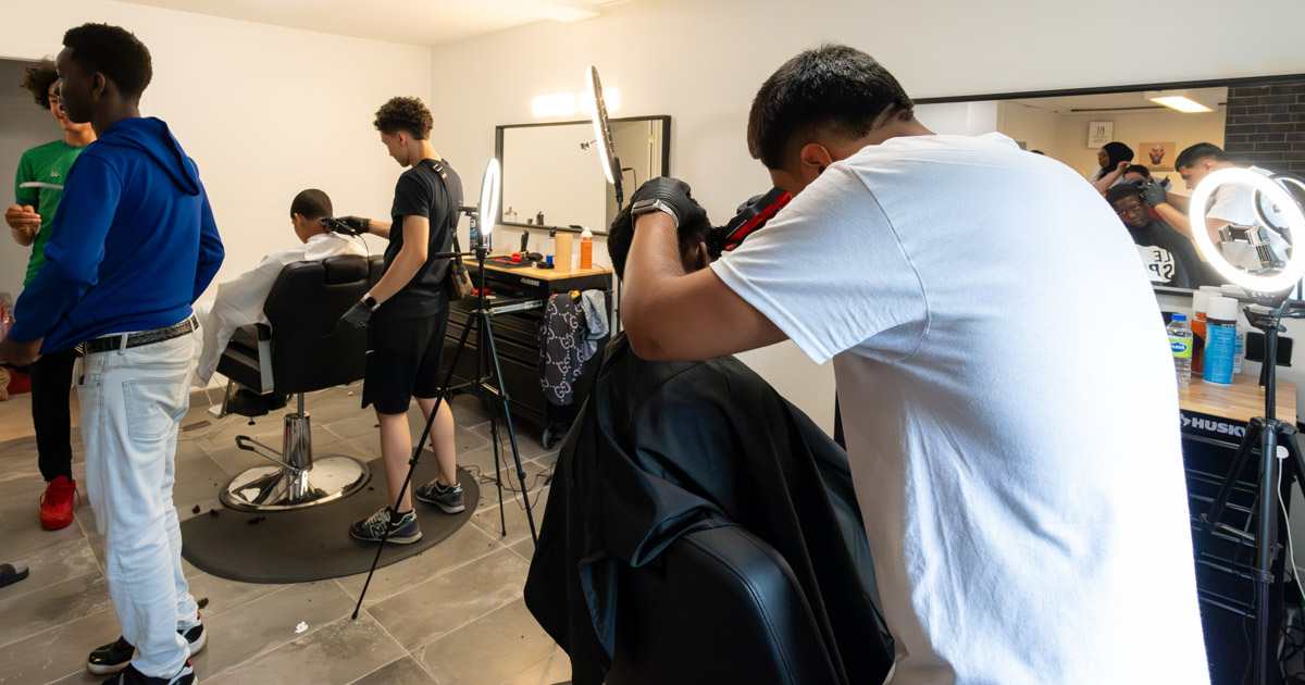 Deux barbiers en action lors de l’ouverture officielle du Spot, un salon de barbier dans les HLM Saint-Sulpice, sur Louvain Ouest. (Photo: François Robert-Durand, JDV)