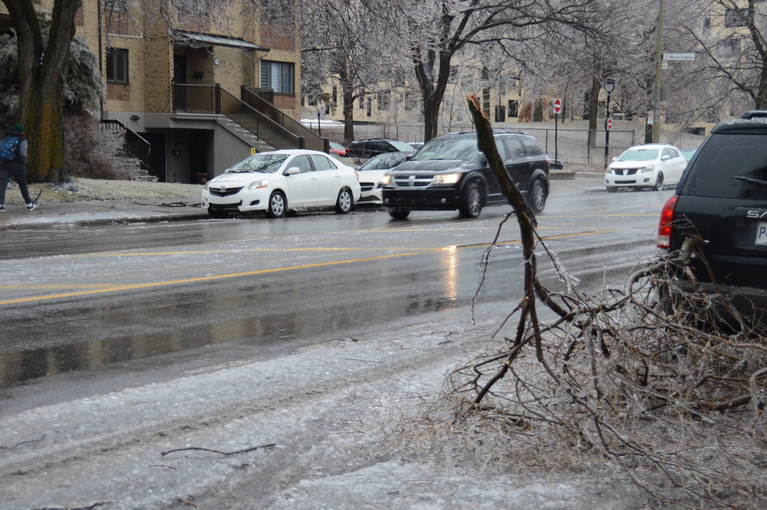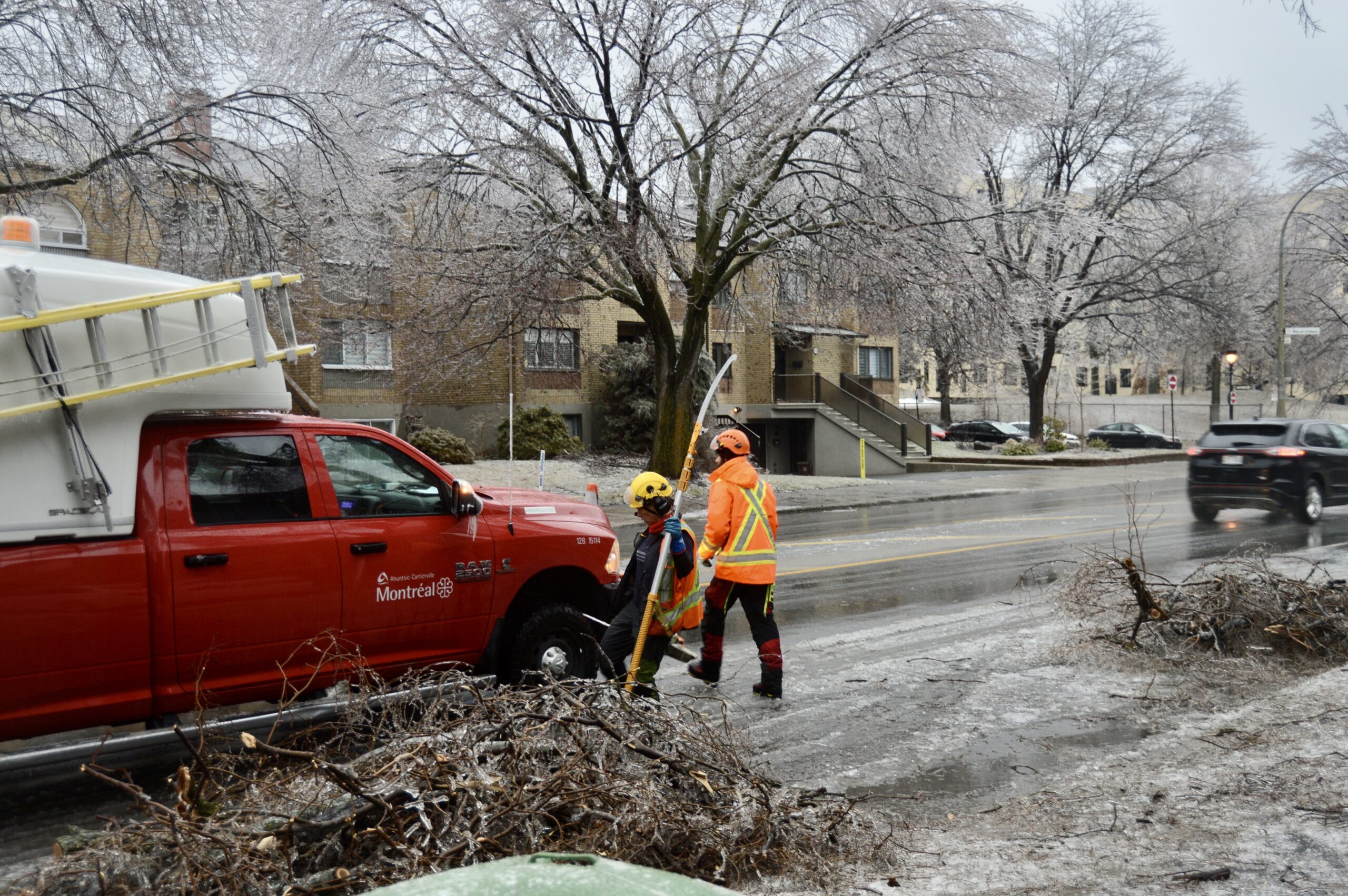 Un des employés nous a expliqué que leur tâche était de «sécuriser» les voies publiques, en regroupant sur le bord des trottoirs les branches tombées sur le terrain des résidants et dans la rue. D’après lui, c’est surtout les ormes qui sont fragiles et leurs branches se rompent facilement sous le poids de la glace.