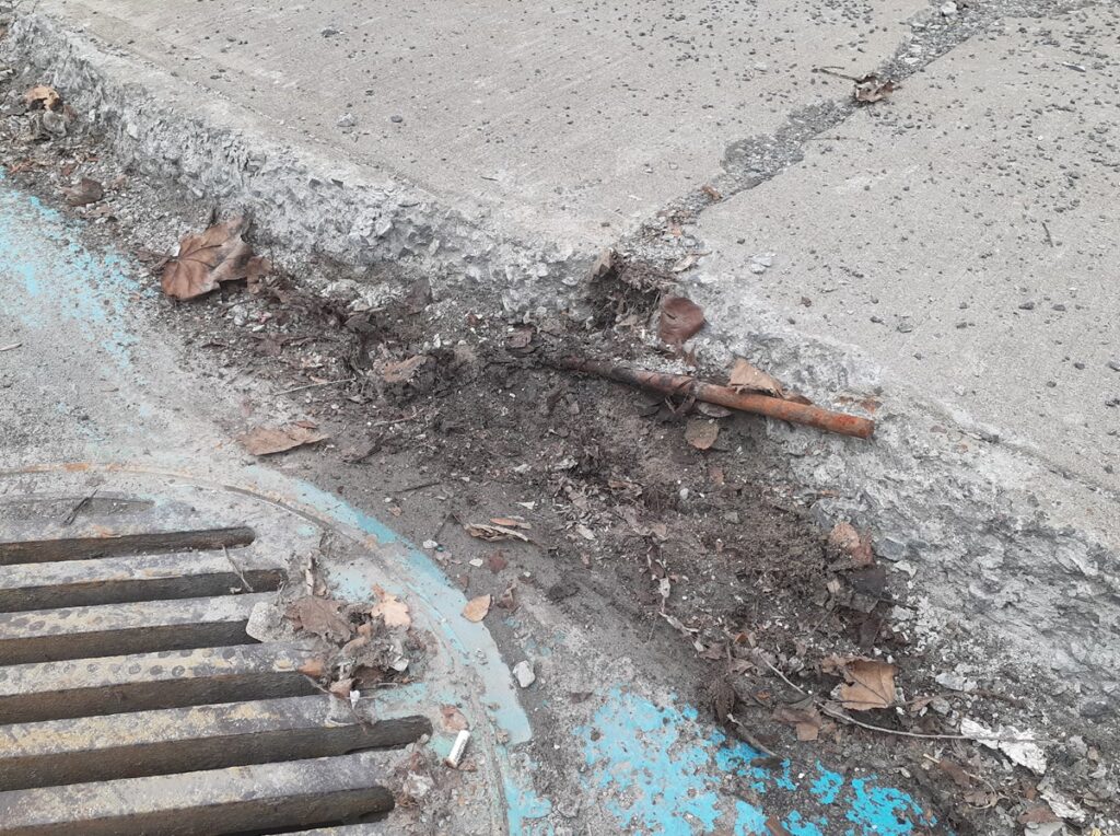 Les trottoirs qui ont été démolis lors de travaux des Travaux publics et qui doivent être reconstruits.
