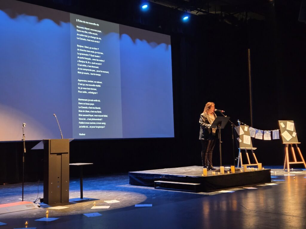 Ils étaient en tout 31 étudiants — de deux classes de francisation — devenus une famille au fil de leur apprentissage à monter sur scène. Tour à tour, ils ont « foncé » fiers de montrer qu’ils ont appris leur « grammaire » et l’ensemble des subtilités de « leur nouvelle réalité ». Un acte de courage qui a transcendé la distorsion phonétique qui transforme le « t » en un « d » pour évoquer l’automne. Ou encore, celle qui le change en « b » pour souligner que, « petit à petit », ils brisent la glace. Pendant une heure, les vers s’échappaient comme s’ils étaient chantés, par moment. Et comme le mentionne Laura dans son poème, chaque syllabe roule comme un souvenir.