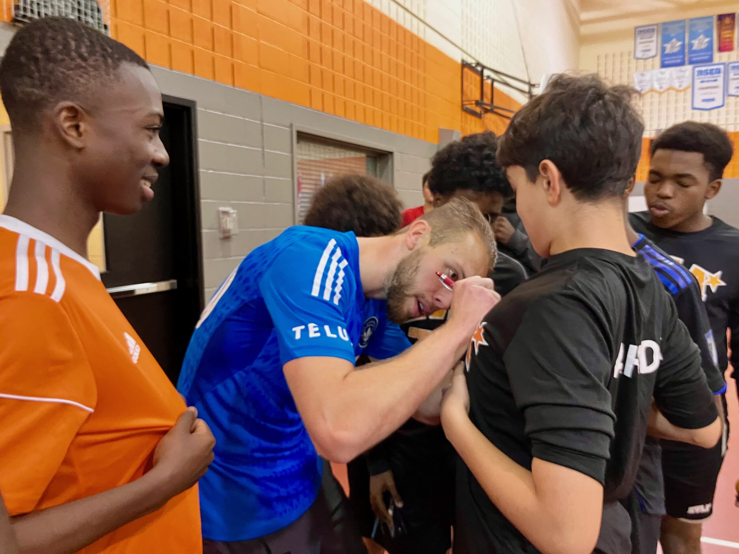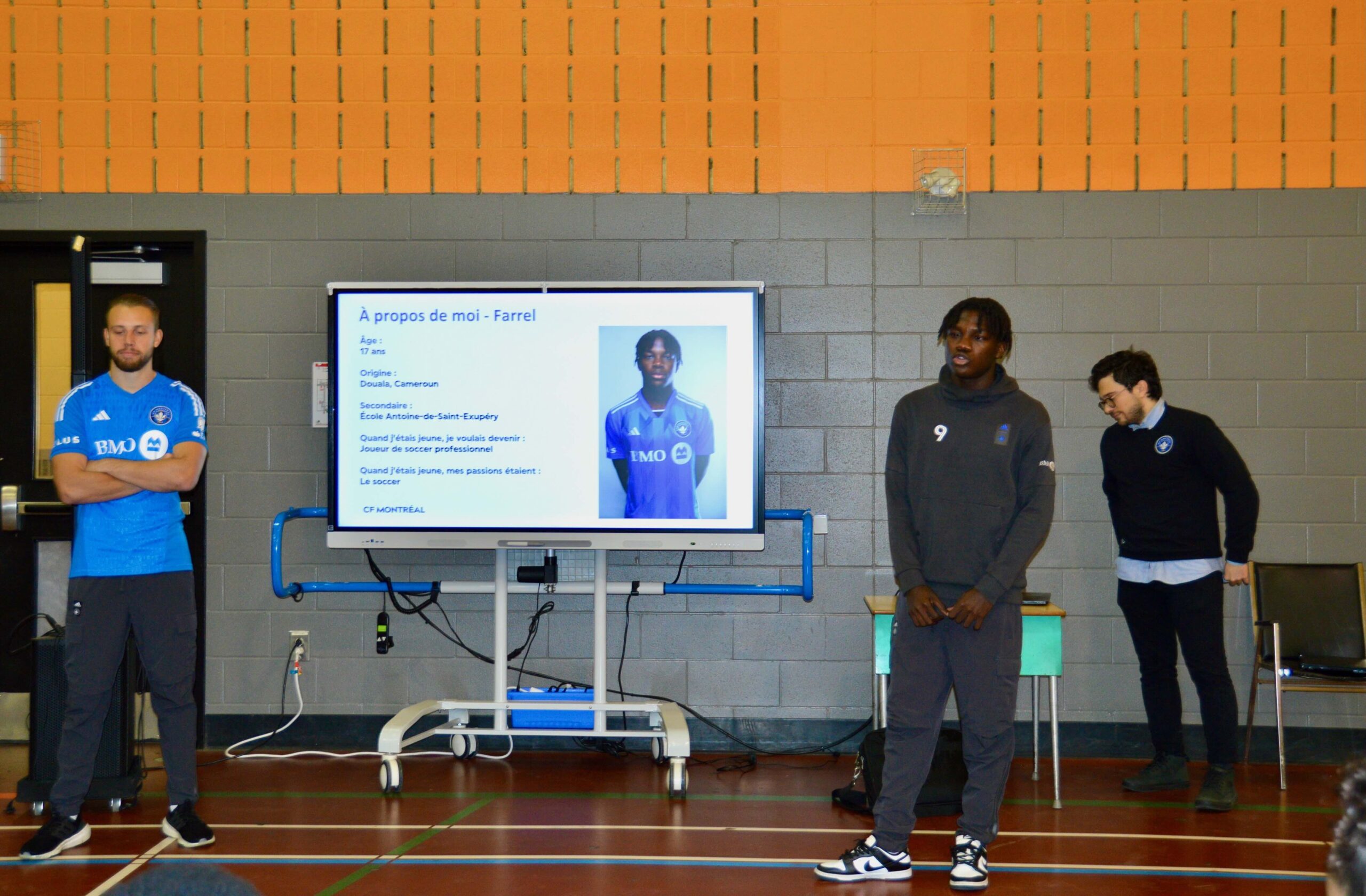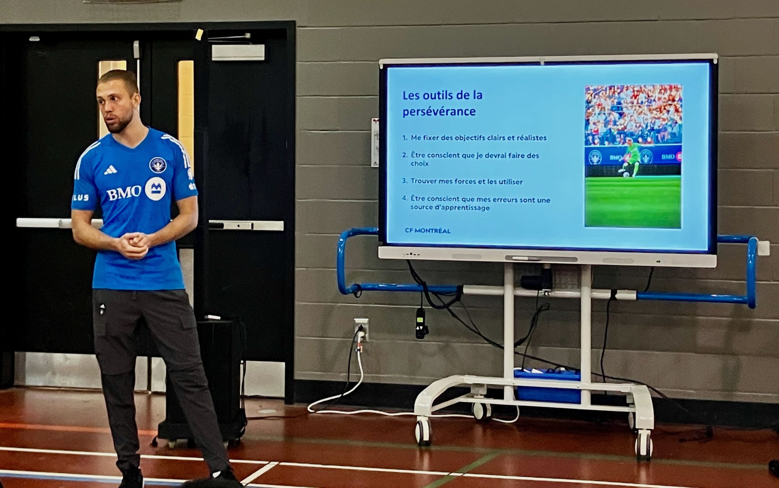 La visite avait lieu dans le cadre d’un partenariat entre le Centre de services scolaire de Montréal (CSSDM) et le CF Montréal, qui vise à soutenir la réussite scolaire par des rencontres inspirantes. Le gardien du CF Montréal, Jonathan Sirois, élu meilleur joueur défensif du club en 2023, et un joueur de l’équipe réserve, Farrel Ngongang, de l’Académie du CF, sont venus raconter leur parcours aux jeunes de l’école Évangéline.