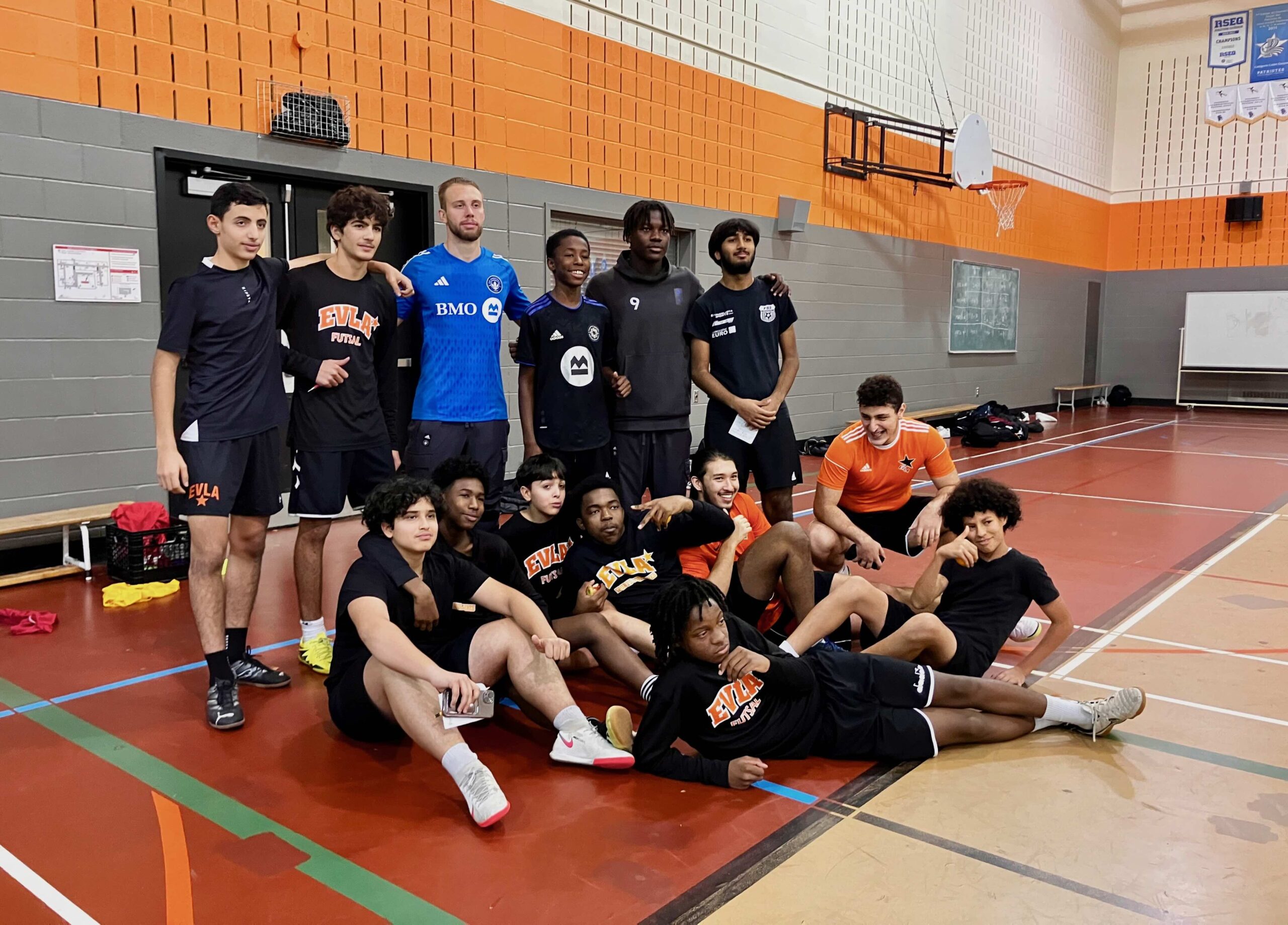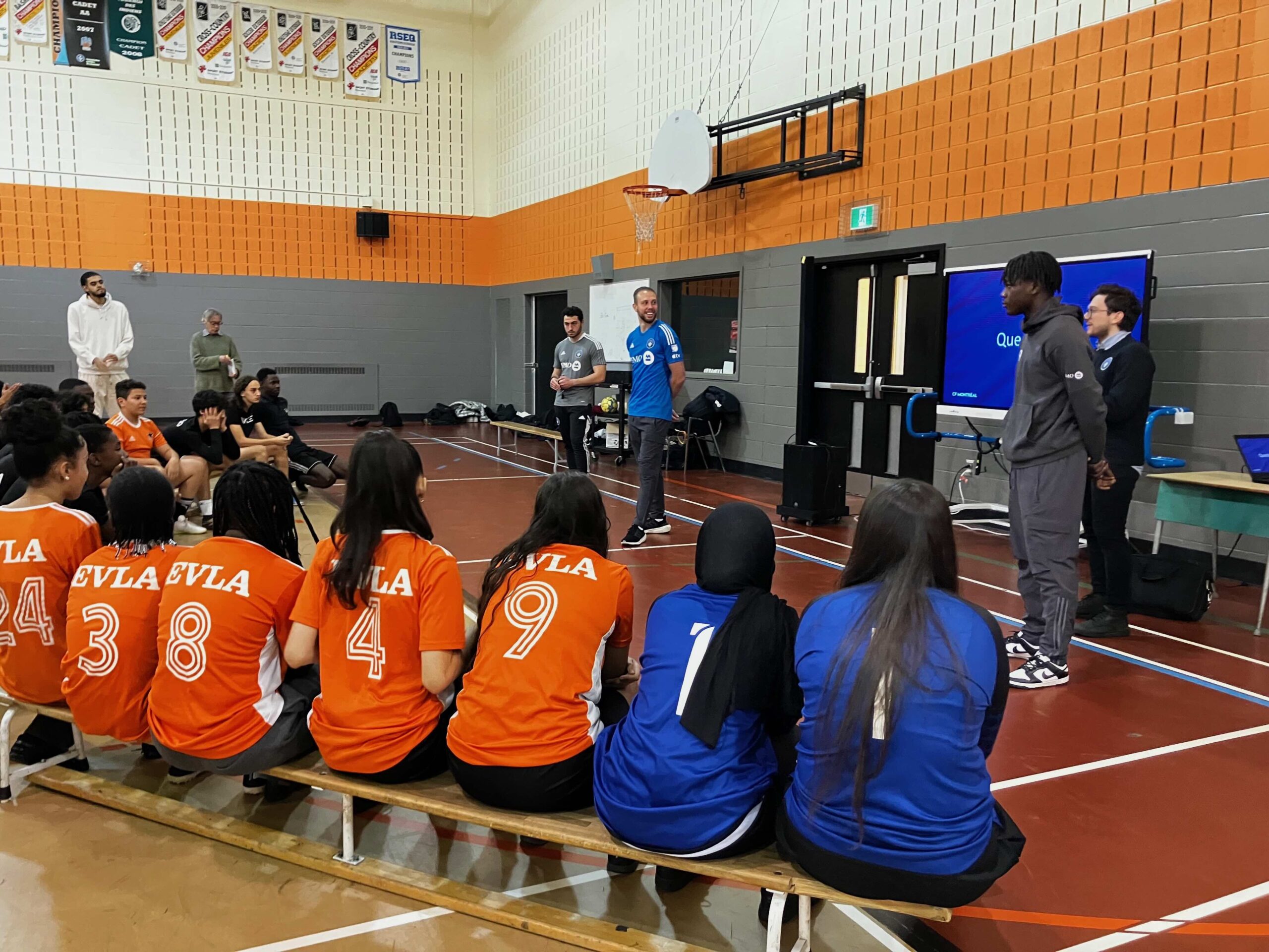 Après la présentation et les questions des élèves, tout le monde s’est levé d’un seul élan quand est venu le temps de jouer – enfin! – au soccer avec Jonathan et Farrel. On a distribué des dossards pour séparer les équipes. Les jeunes portaient déjà leur chandail de l’école, dont le logo EVLA représente les deux écoles secondaires Évangéline et La Dauversière (secondaires 1 et 2).